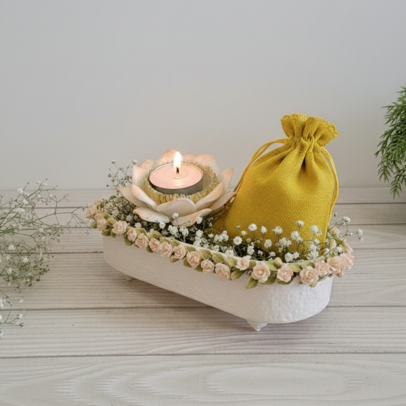 Light up your celebrations with our Sunny Bloom festive hamper. A beautiful ceramic tray, rimmed with delicate roses, holds a radiant floral tea light holder and a cheerful yellow potli pouch, all nestled in a bed of baby's breath. This graceful arrangement is a perfect gift for Diwali, housewarmings, or any joyous occasion.